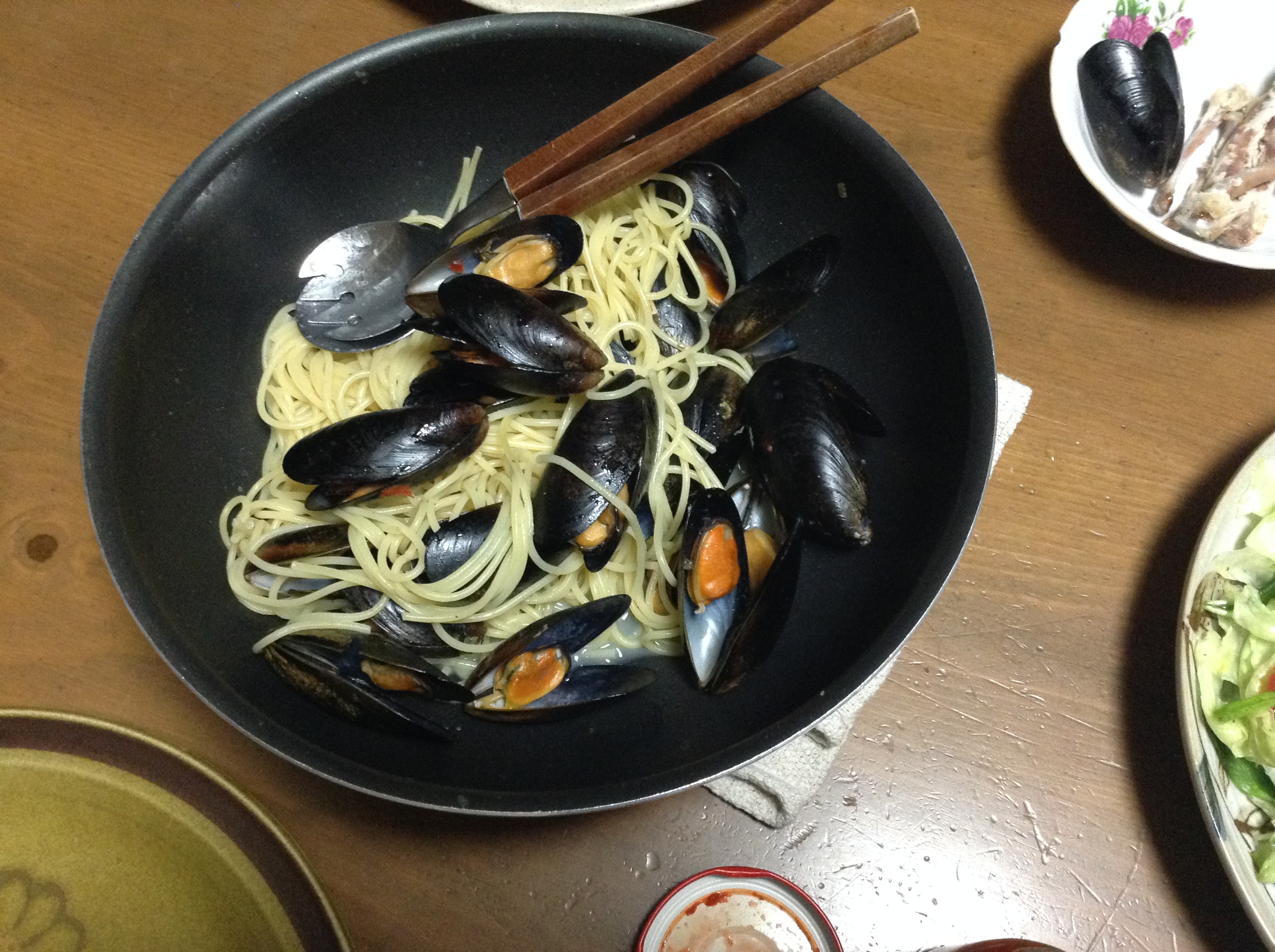 もうね、パックから出して凍ったままフライパンで蓋してね。貝が口開けたらもうガーリックバター味付いてるわけ。貝のスープもたっぷり出てるので