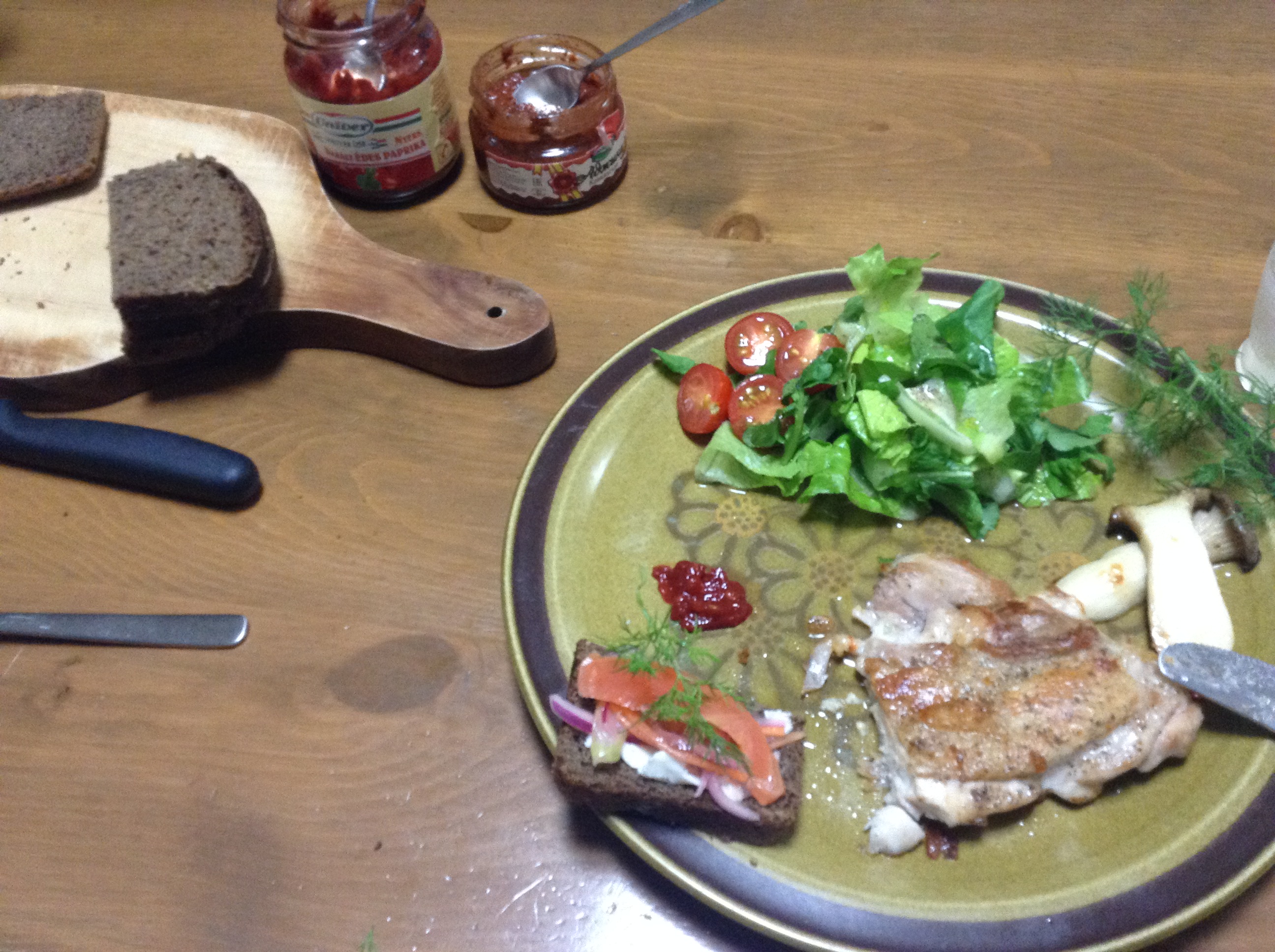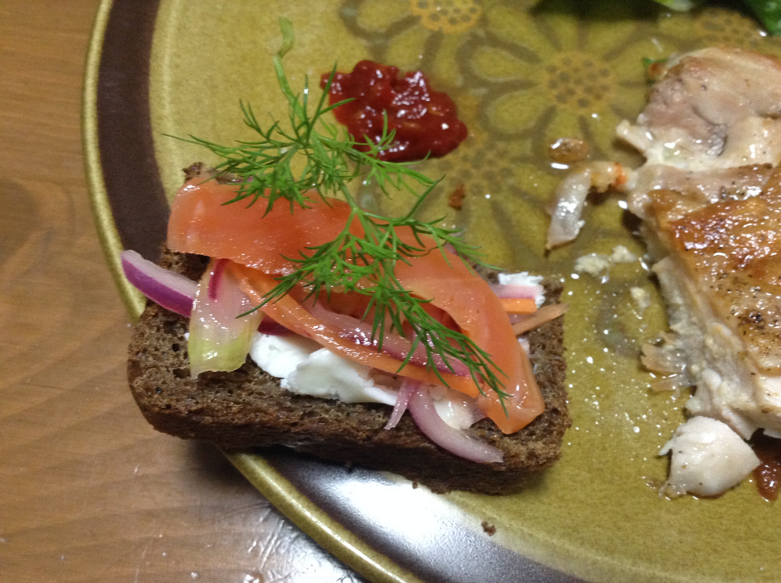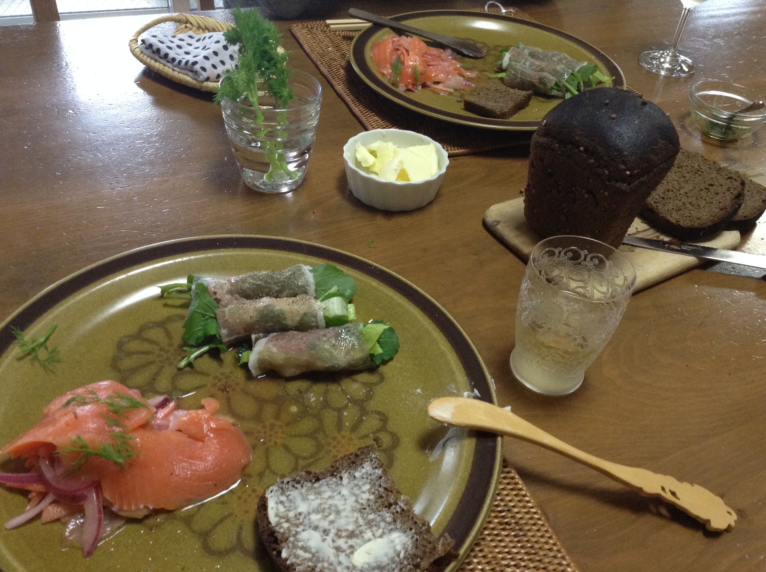バラディンスキーにたっぷりバターを塗って、マリネーゼしたサーモンにディルをワッサワサ乗っけたのを、パクッ!